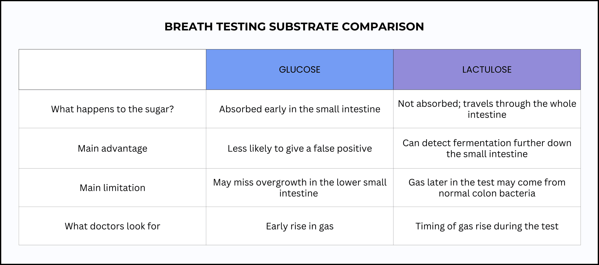 Breath tests measure gases produced when microbes ferment a test sugar. The two most common sugars used are glucose and lactulose. These sugars behave differently in the body, affecting where fermentation can occur during the test.